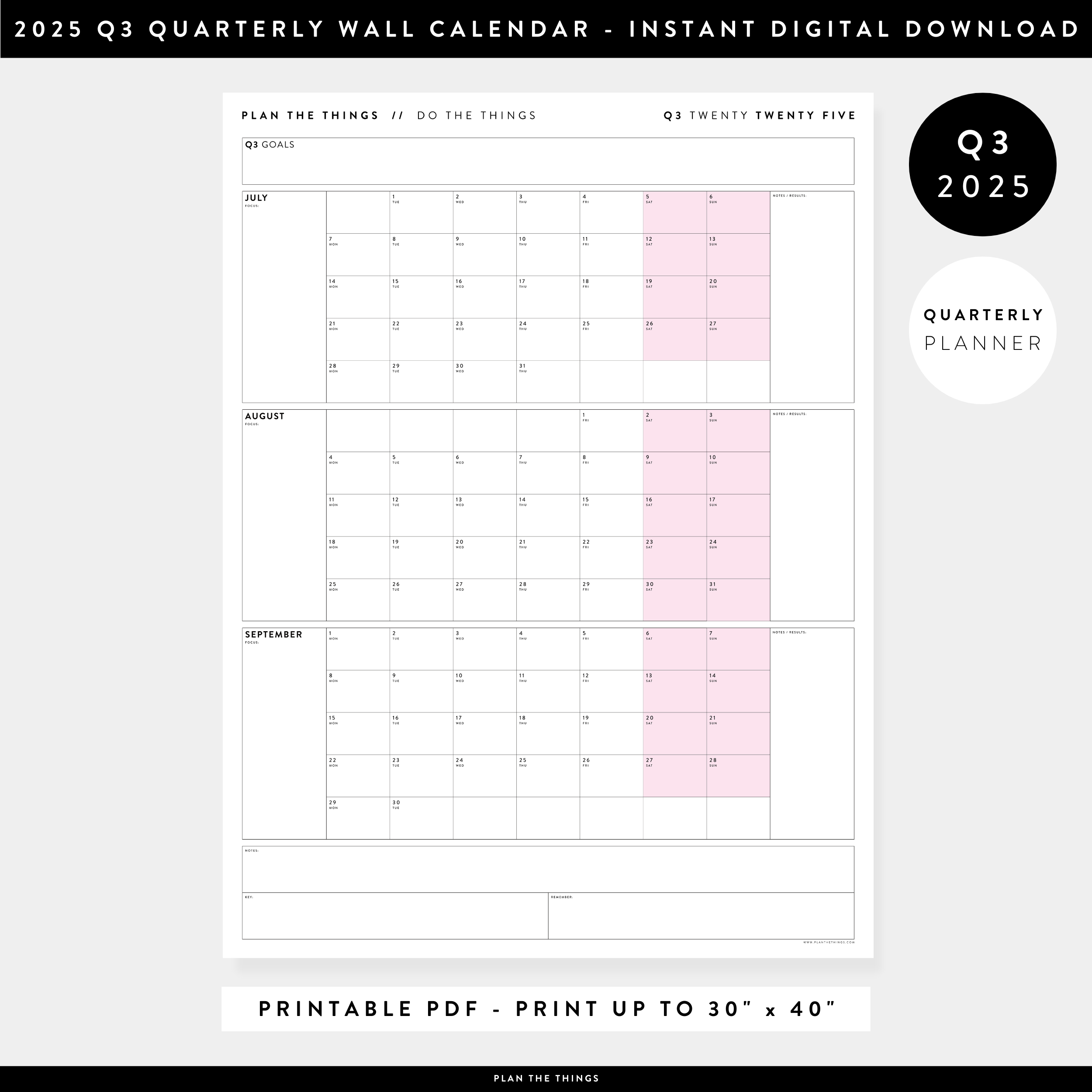 PRINTABLE Q3 (JULY SEPTEMBER) 2025 QUARTERLY WALL CALENDAR (PINK